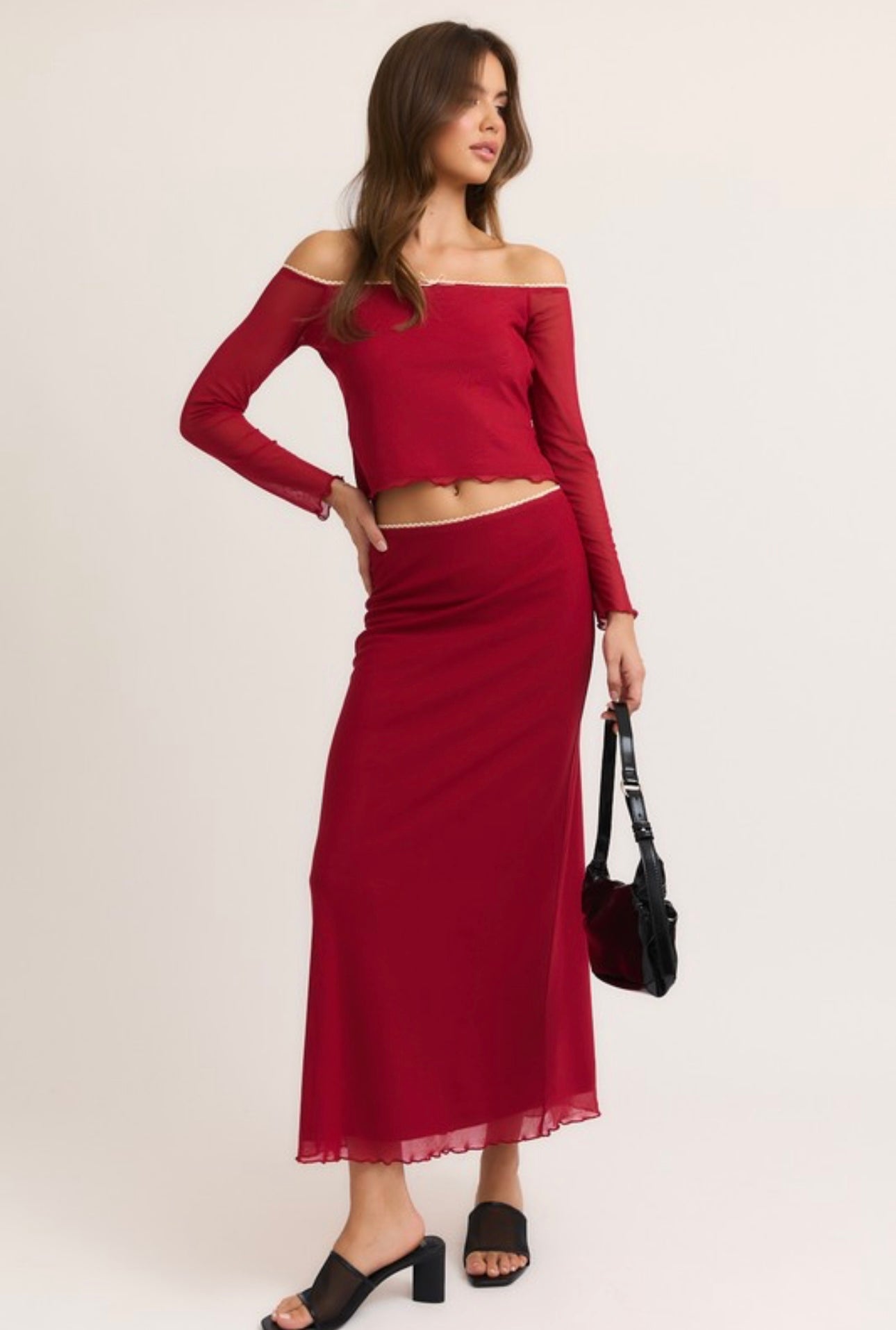Off the shoulder lace trimmed mesh top with maxi mesh skirt.